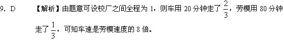 9.某校下午2点整派车去某厂接劳模作报告,往返须1小时。该劳模在下午1点整就离厂步行向学校走来,途中遇到接他的车,便坐上车去学校,于下午2点40分到达。问汽车的速度是劳模的步行速度的几倍?( )。