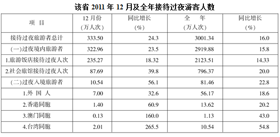 2011年某省接待过夜游客总量再次实现突破,达到3001.34万人次,同比增长16.0%。实现旅游收入324.04亿元,同比增长25.8%。12月份宾馆平均开房率为74.02%,同比增长0.06%;全年累计宾馆平均开房率为62.37%,同比增长2.0%。